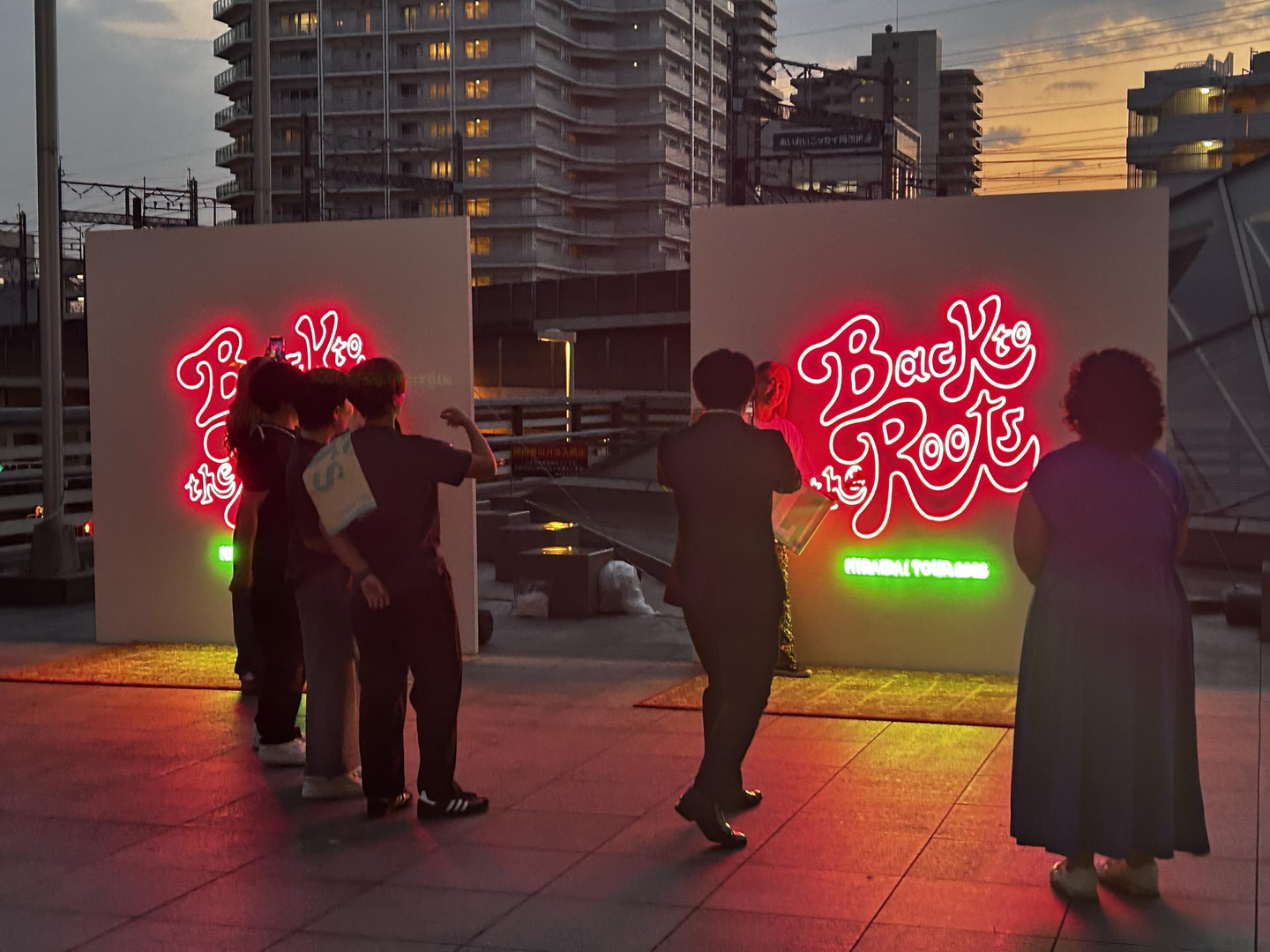 ネオンが可愛いフォトスポットでは、グッズのタオルやTシャツを着用したファンで