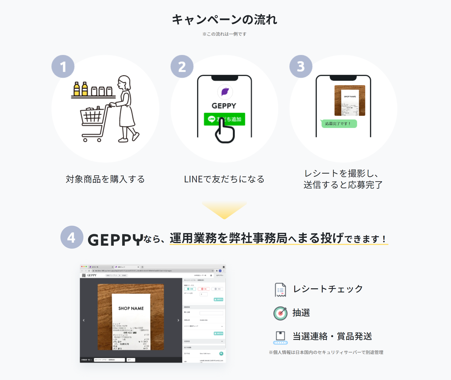 新家:例えばスーパーなどで商品を買って応募したら、テーマパークのペアチケットが当たるキャンペーンって以前からありましたよね。今まではバーコードや商品付属のシールをハガキに貼っていたけれど、GEPPYならスマートフォンで、レシートの写真を撮って、それをLINEのトークルームにアップするだけで応募が完了できる。応募が手軽にできるのがメリット。