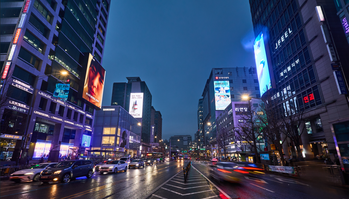 地下鉄2号線と空港鉄道が交わる交通の要所。平日も週末も、美容意識の高い韓国の若者と観光客が行き交うこの場所で、私たちの商品が注目を集めています。