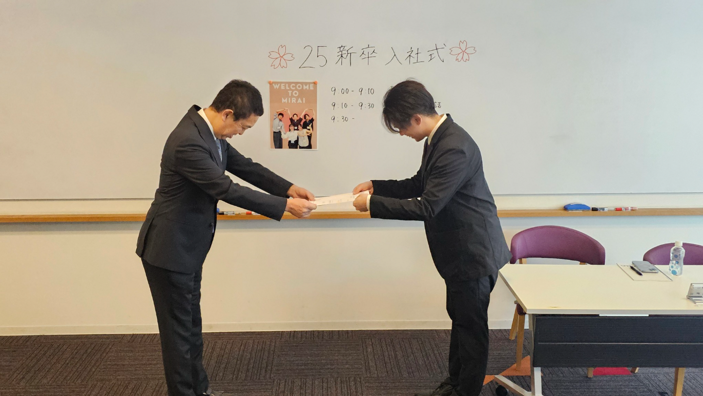 4月1日(火)、25卒の新入社員5名が未来ファミリーに仲間入りしました! 内定者懇親会でもお馴染みだった5人が、ついにそろって入社式に出席。
