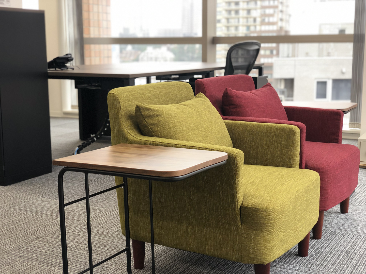可愛い一人がけ用のソファー。気分転換をしたり、軽い打合せなどに利用します。