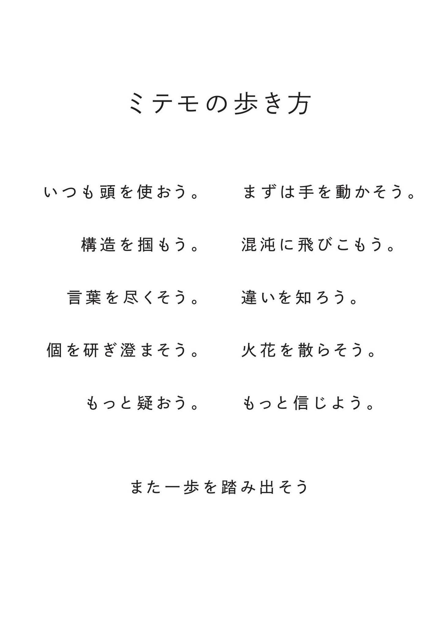 一筋縄ではいかない人たちだらけのチーム。それが、ミテモです。そこに道があれば、あえて脇に逸れてみる。そこに地図があれば、あえて自分の手で地図を描き変えてみる。安易に共感しないし、決して同調しない。よく言えば、一人一人がインディペンデントでユニークであることを重んじる僕たちが、その違いからこそ何か新しい物事を生み出すための道具。それがこの「ミテモの歩き方」だと僕は思っています。