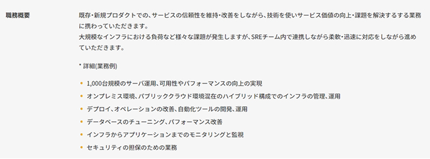 ──疑ってすみません…ですが、SREはある程度の経験やスキルがなければできない仕事ですよね。求人情報の職務概要を見ても、難易度が高い印象を持ちました。