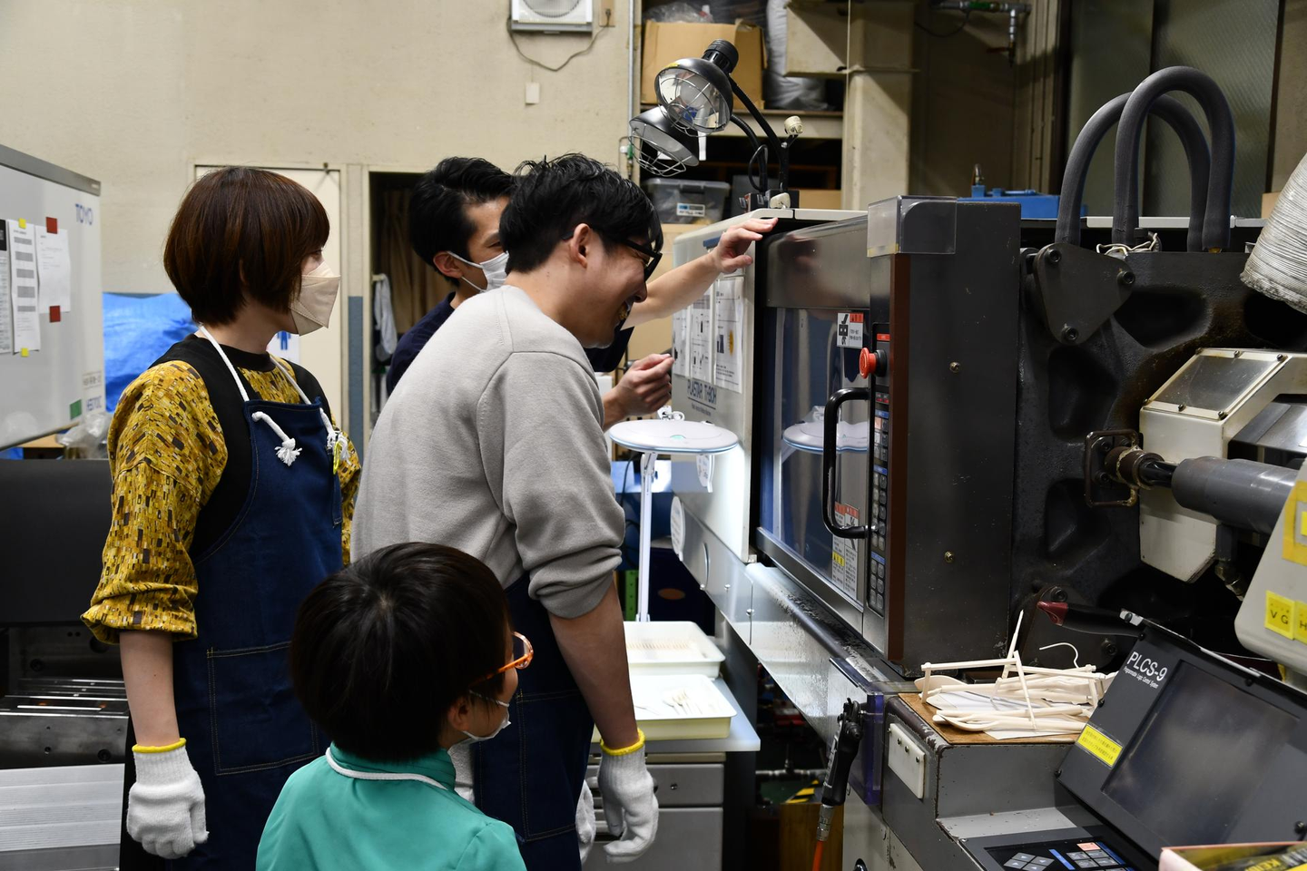 去年の体験でもおこなっていた自社開発製品の柄の長いスプーンSNOPPOの射出成形体験。今年は白色のライスレジンという材料で成形を体験していただきました。出来立ての時はほのかにお米の香りがして、いい匂いでした。これは金型が横に開閉する横型成形機で、アニマルクリップの体験をした竪型成形機との違いを比べてみるお客様もいらっしゃいました。