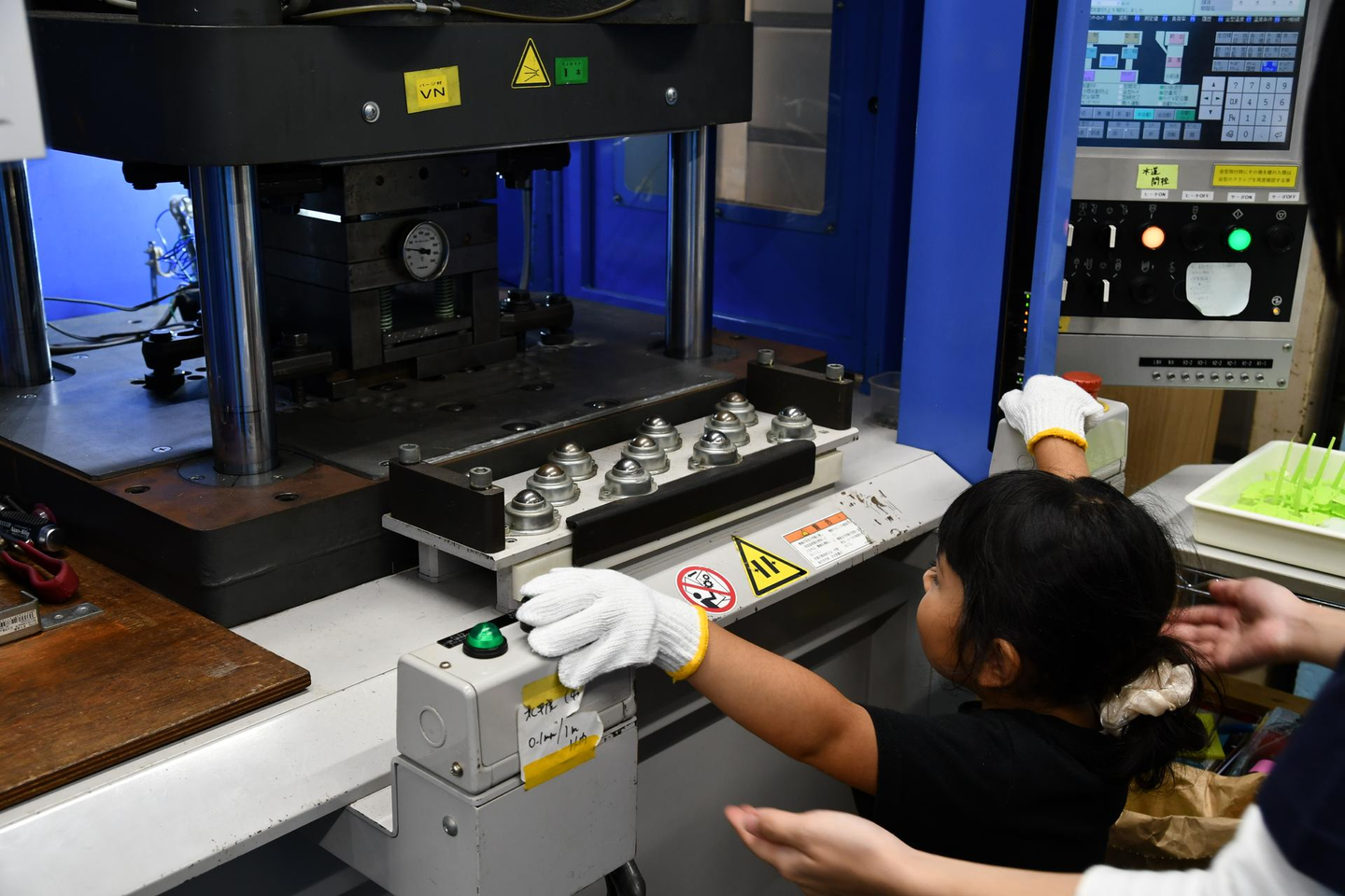 かわいい小さなアニマルクリップを40tの竪型成形機で取り出す体験を行います。この射出成形機は両サイドのボタンを押すことで成形がスタートします。この射出成形機は縦に金型が開閉する竪型成形機。製品が出てくる様子もよく見えてお子様にも大好評でした。
