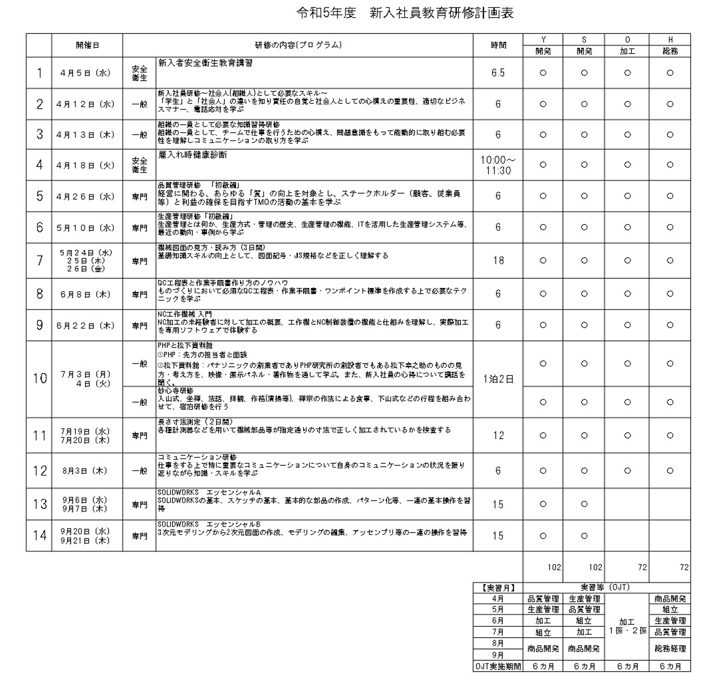 今年度入社のメンバーの外部研修(OFF-JT)の研修計画表です。