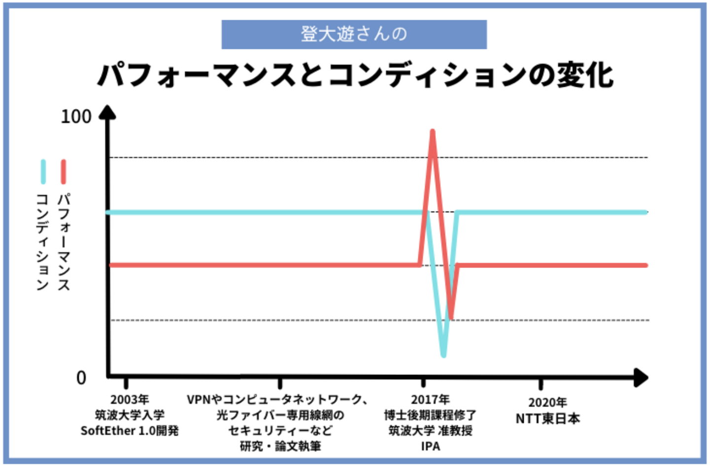 ここでのポイントは記事にある登大遊氏のみならず、私が今まで出会ってきたハイパフォーマー(大学時代の研究者や社会人経験の中での意味不明なレベルでどえらい成果を出す人)や、安定的に企業や社会に貢献されている方に共通しているのは、とにかく当たり前にすべき事を集中しながら淡々と高速にこなし(グラフ上のフラットな状態)、その結果を適切に積み上げているという共通点があるという点です。(記事中のピークは、寧ろそうじゃない状態=好ましくない状態だよねと理解している)