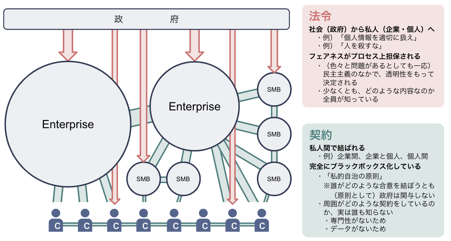 ここでいう合意ないし契約とは以下の図を参照いただくとわかるように、大小の企業やコンシューマの間で形成される関係の数だけ生成しうるものです。