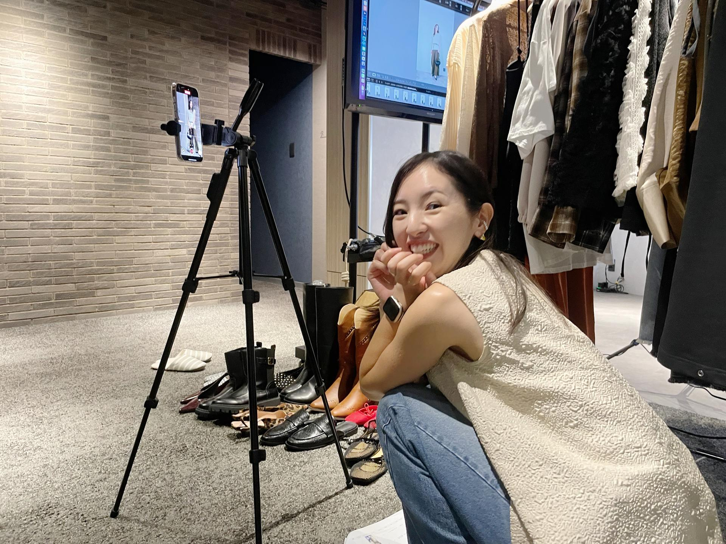 アイテムのセレクトやコーデ設計の後、【魅せる準備】では、コンテンツ企画や小物用意、モデル・カメラマンとのやり取りなどを行い、撮影へ。撮影後は画像選定や加工、動画編集、システム登録を経て、SNS投稿やLINE配信という【発信】の段階へ。最後に【お届け】しながらSNSやお客さまの反応を分析し、次につなげます。