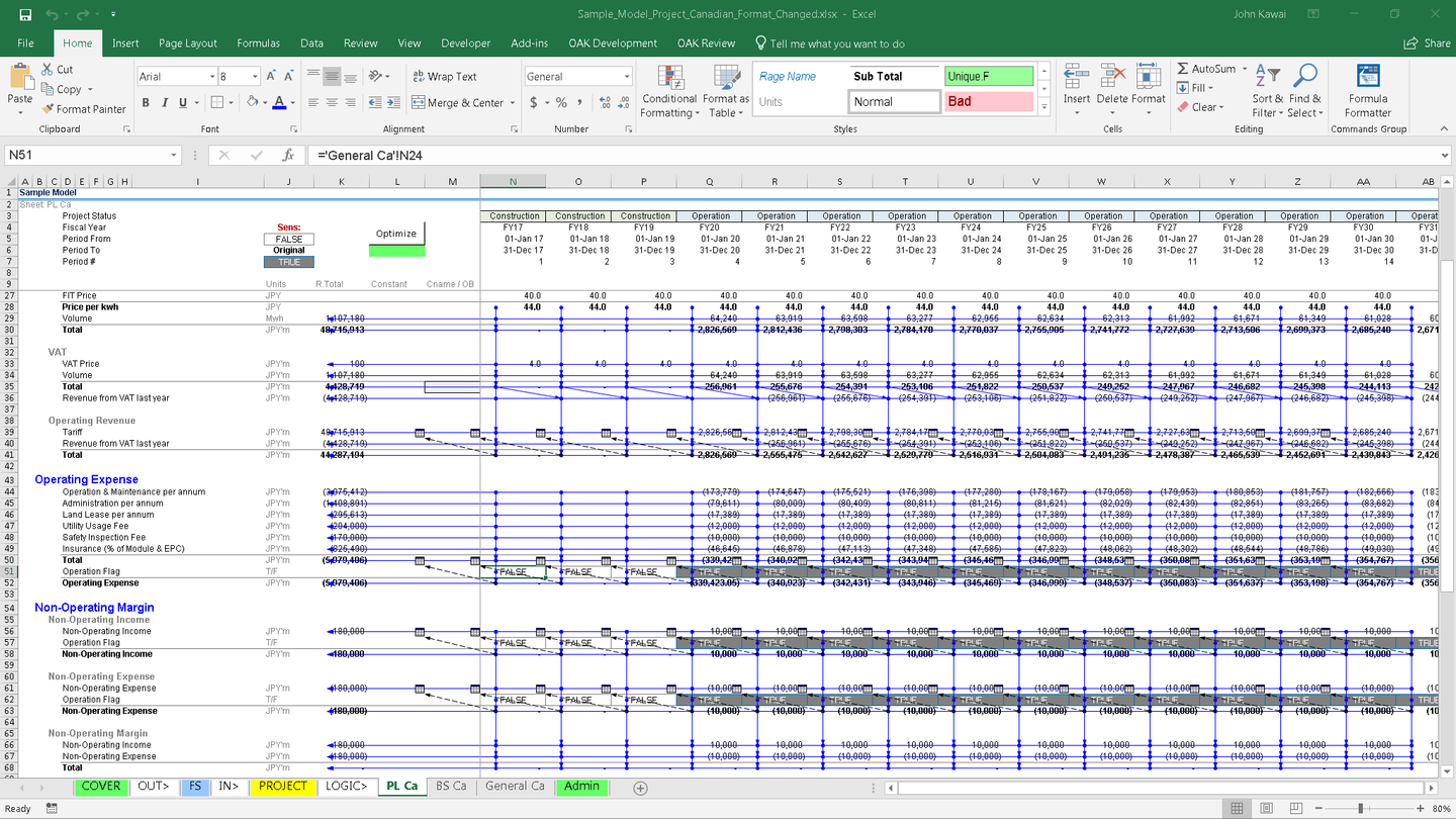 <私達のチームが作る財務モデル。青文字のヘッダごとにモジュール単位で計算。>