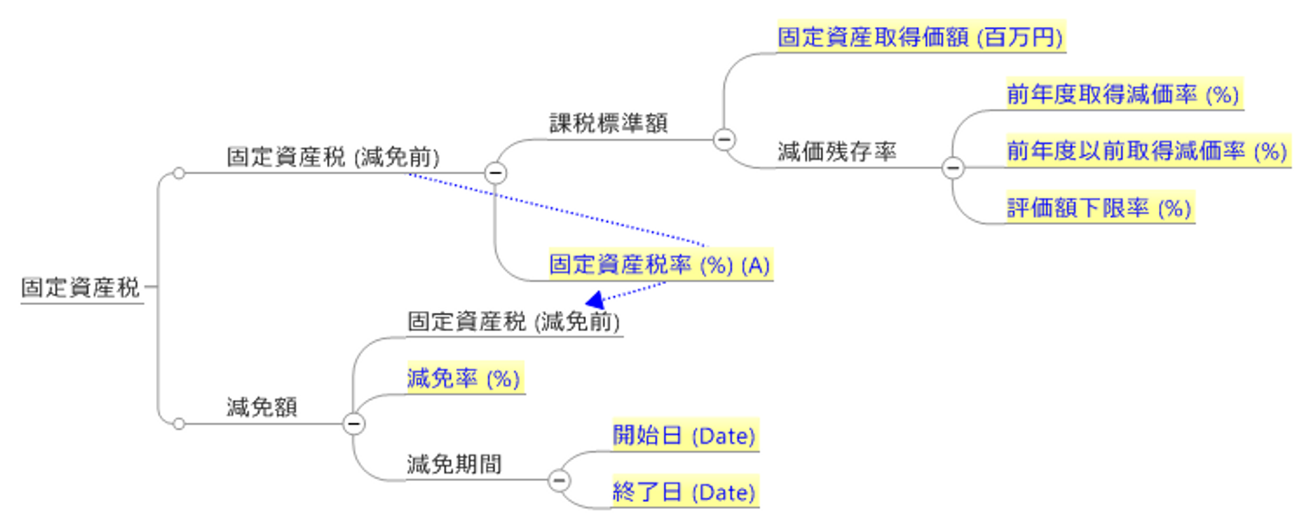 上記の見方は、左側がアウトプット、右端に位置する黄色部分がインプットとなります。上記の例で言えば、ある該当年度の固定資産税を計算するためには、下記のインプット一覧が必要となります。