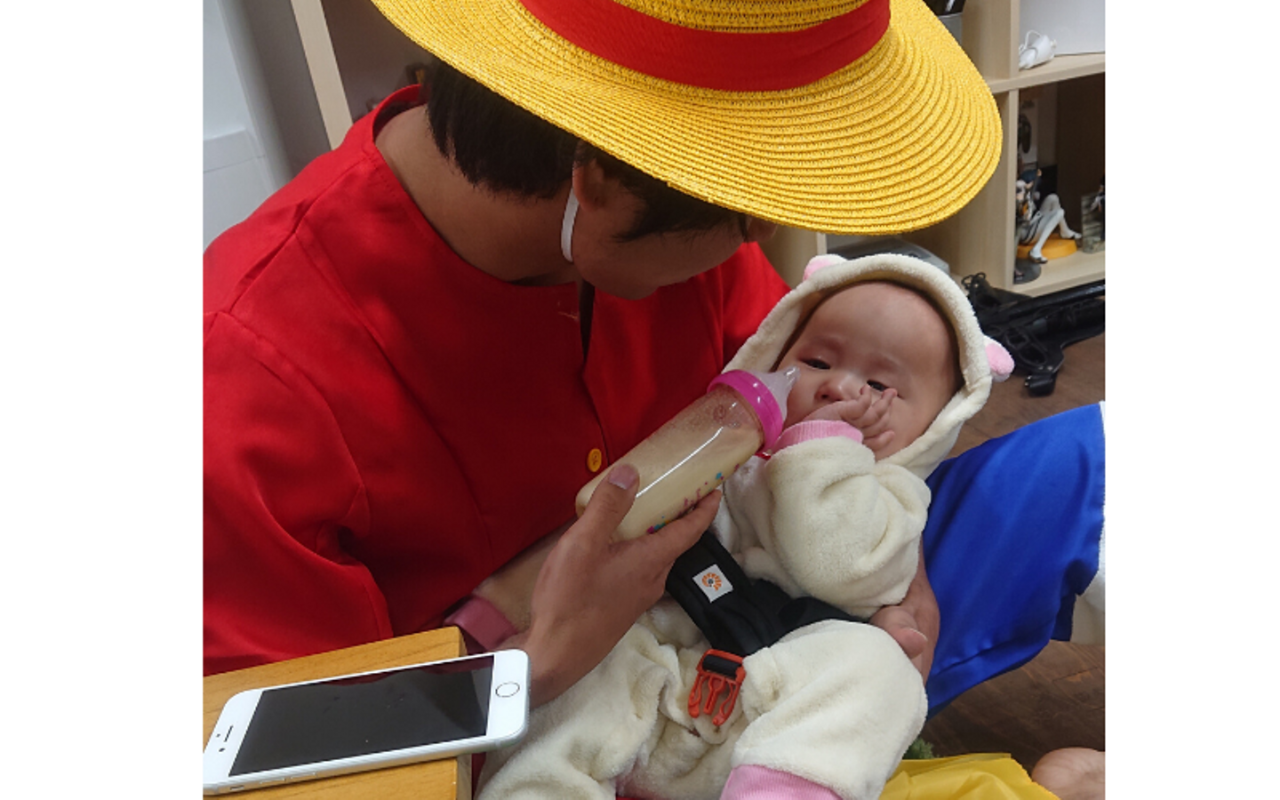 ルフィーにミルクを飲ませてもらうコリラックマ。笑