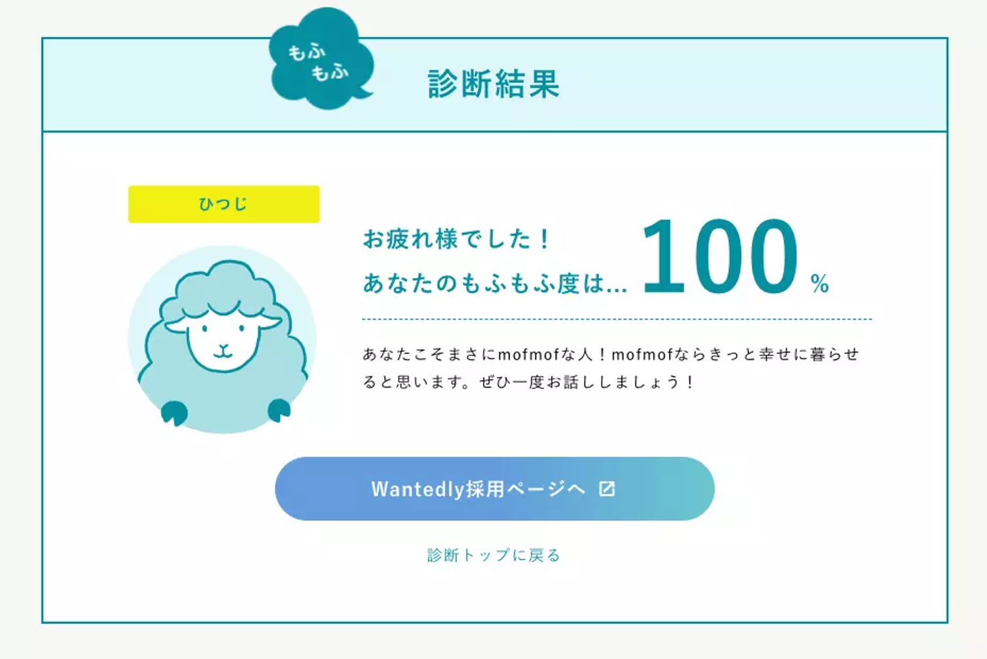 この度、弊社のホームページ内に、mofmofと応募者の皆さんのマッチ度をチェックできるコンテンツ「もふもふ診断」をオープンしました。