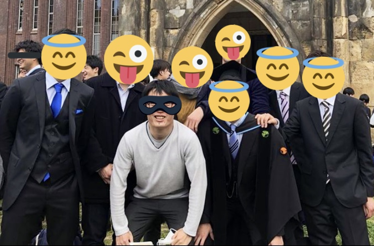 (アメフトサークルの同期と学部4年の卒業式の写真。あっかんべーしたスタンプの3人と白い服の私は留年しました)