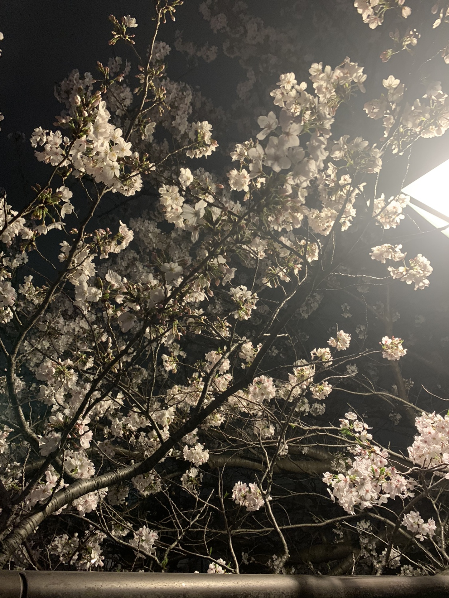 入社してちょうど一週間が経った頃、高校時代からの友人と目黒にあるイタリアンレストランで思い切り食べた後に取った桜の写真です。昼間の目黒川はカップルや観光客で賑わっており、雑踏に埋もれそうでしたが、夜になると人が少なく、静寂の中で桜を楽しむことができました。