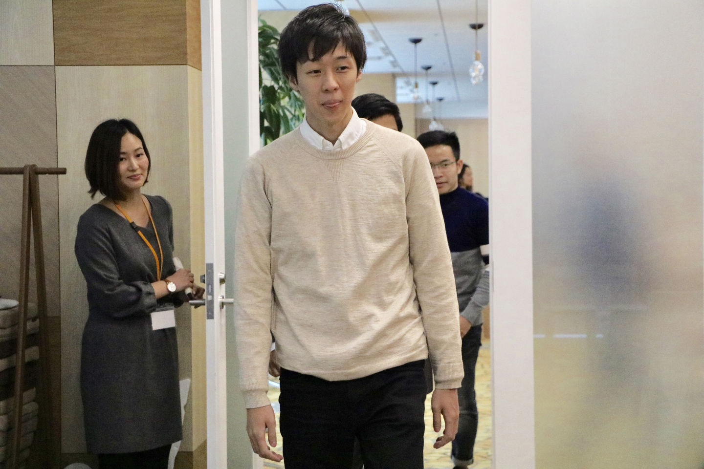 役員やマネージャー陣が、本日入社する仲間をお迎えします!入場前にそわそわ...。