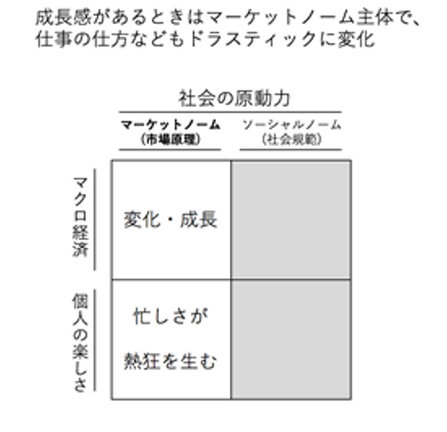 マーケットノームを推進するときは、たとえば、農業が工業に代わるときとか。さっきおっしゃったように、日本でまだマーケットノームがものすごい大事なのは、つまり既存の固まったシステムを大きくドラスティックに変化する時には、なんか 圧倒的に拡張的プロセスがあって、ぶっ壊す っていう。それがこっち(マーケットノーム)。ソーシャルノームは どっちかっていうと停滞 。今の関係性で行きましょうっていうときのモードかと思います。