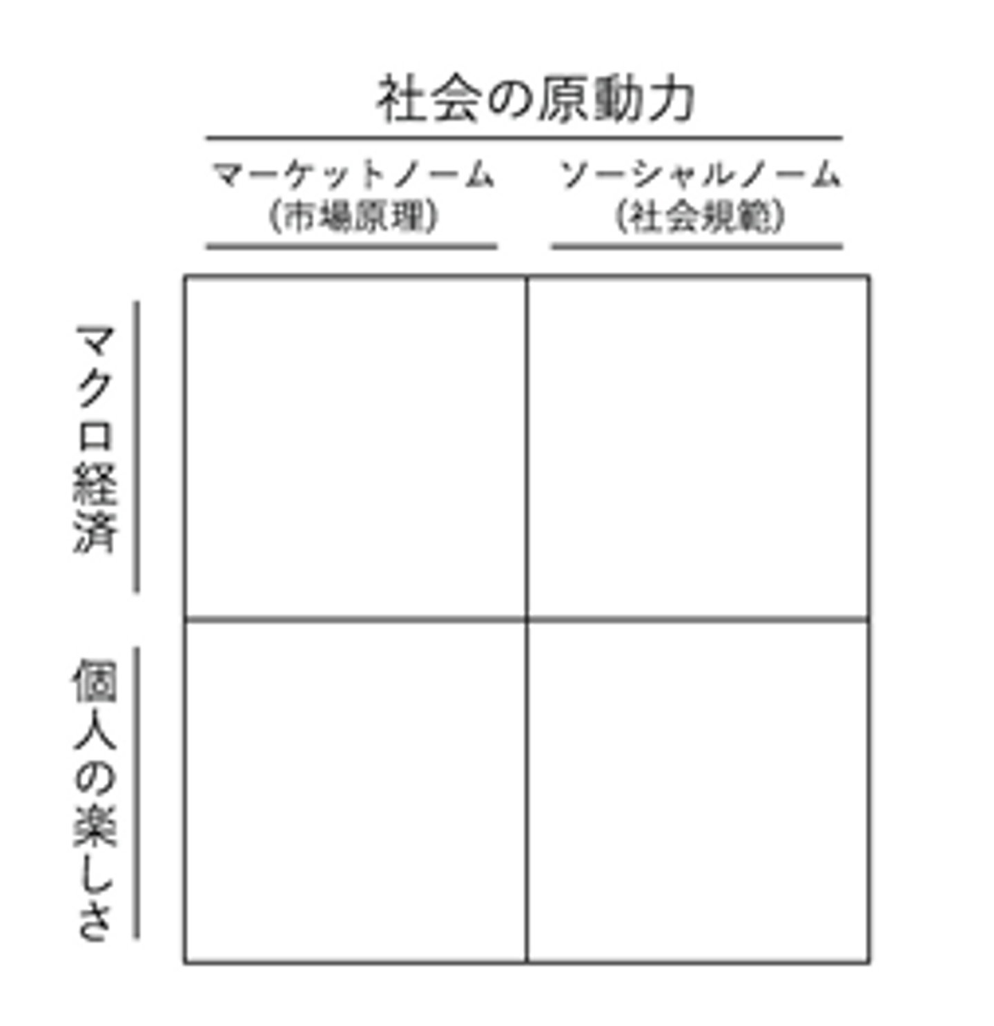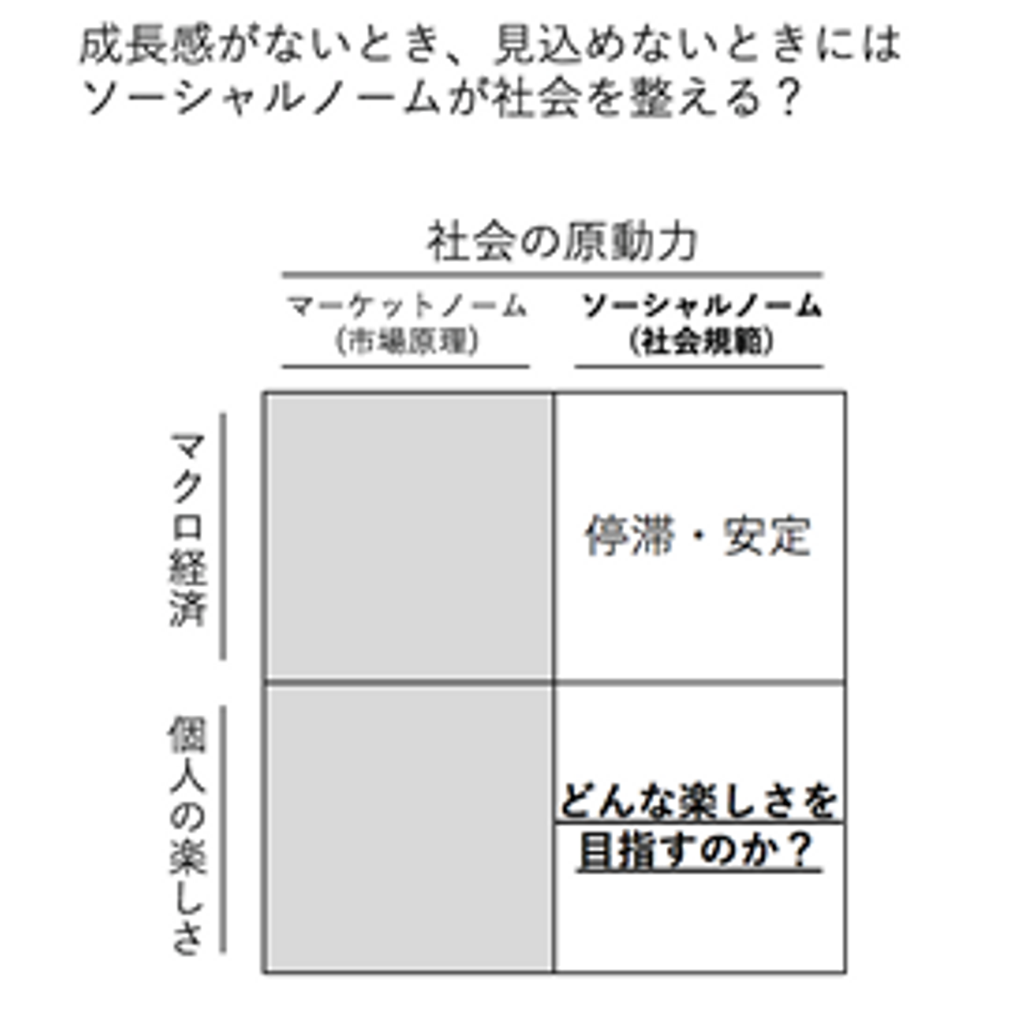 その成長感の中の楽しさはみんなわかってる。問題は、ソーシャルノームで、生産性や成長性はないんだけど、何で楽しみを得られるかっていう解が、これは意見ですけど今までそんなになかったんですよ。でもこれは実は大問題で、社会全体を上の世界で最適化していった時に、1億人いるけど、ぶっちゃけ500万人が働けば、1億人食わせられるような世界になるってなった瞬間に、さっきの仕事の役割の話で、役割により喜びを得たいって思っている人が残り9000万人いるのに、上の世界でいったら、要りませんからってなると、無理くり見せかけの成長を作るか、ここ作んなきゃいけないかっていう話になって。ここが落ち着いていないから、割といろんな話っていうのがでるのかなと。