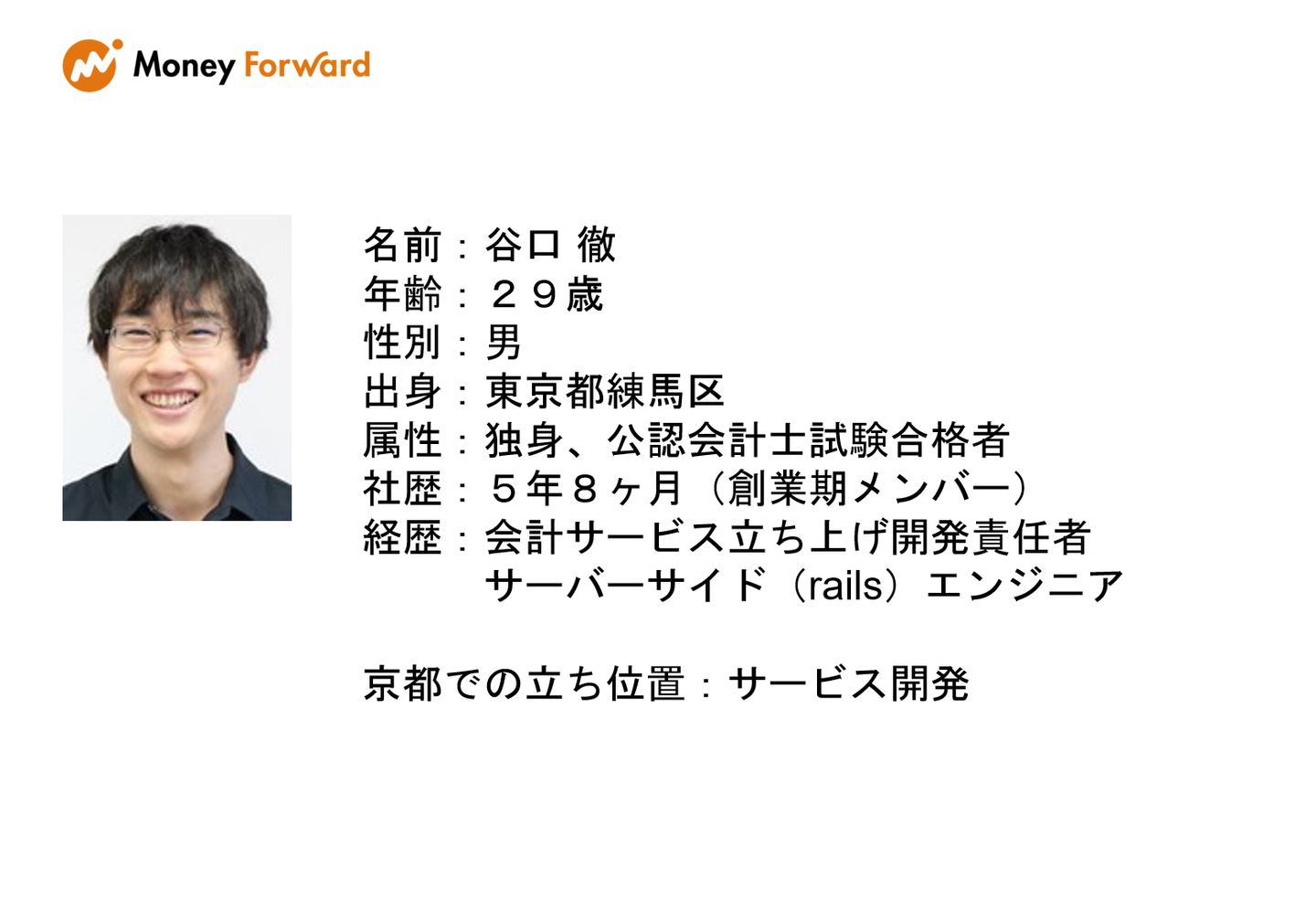 谷口:生まれも育ちも東京都練馬区で、東京以外に住んだのはこれが初めてです。新卒の時の会社も5人ほどの社員しかおらず、マネーフォワードに入社した時もまだ10人ほどの規模でした。昔から小さいところから盛り上げていくことが好きなので、今回の京都の開発拠点の立ち上げも手を挙げて移住してきました。