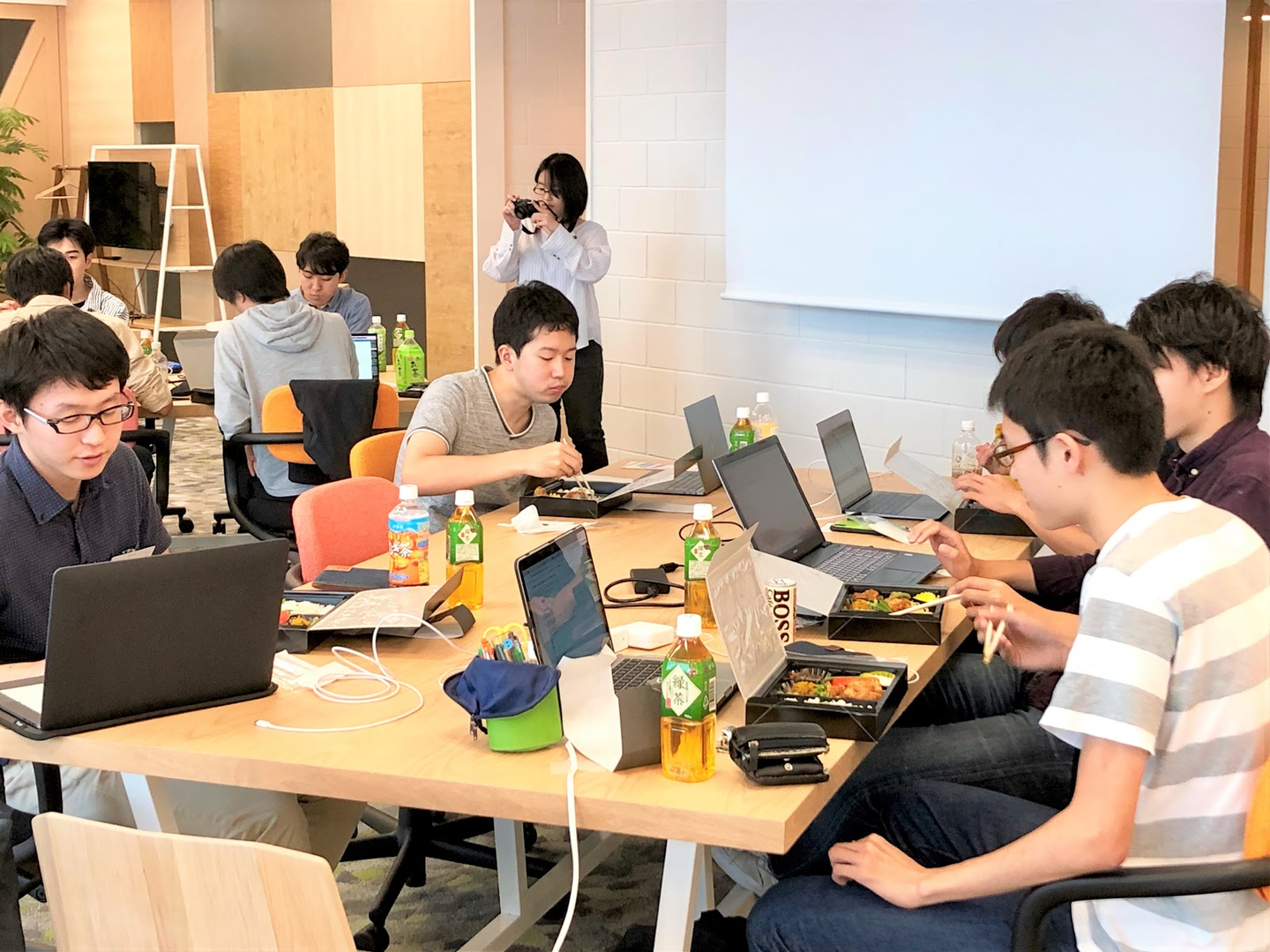 の4名のほか、経営企画室でデータ分析を行う酒井や、2日目後半にはLabの技術顧問でもある理化学研究所の関根博士がメンターとして参加しました。