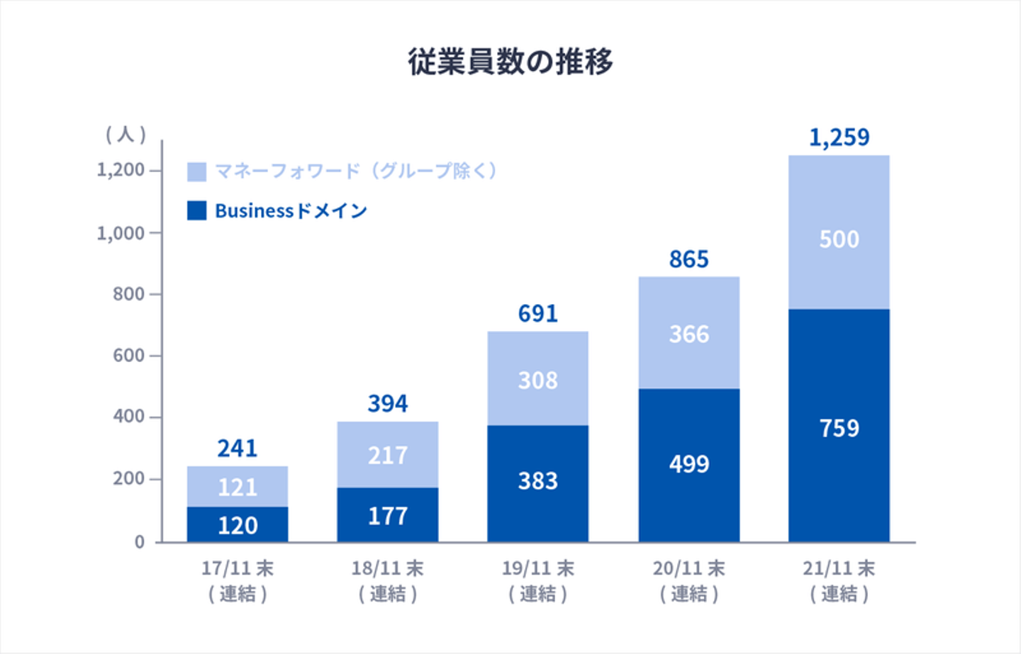 先日の決算発表でもお伝えしていますが、17年11月末に241人だった正社員数は、20年11月末には865人、21年11月末には1,259人になりました。