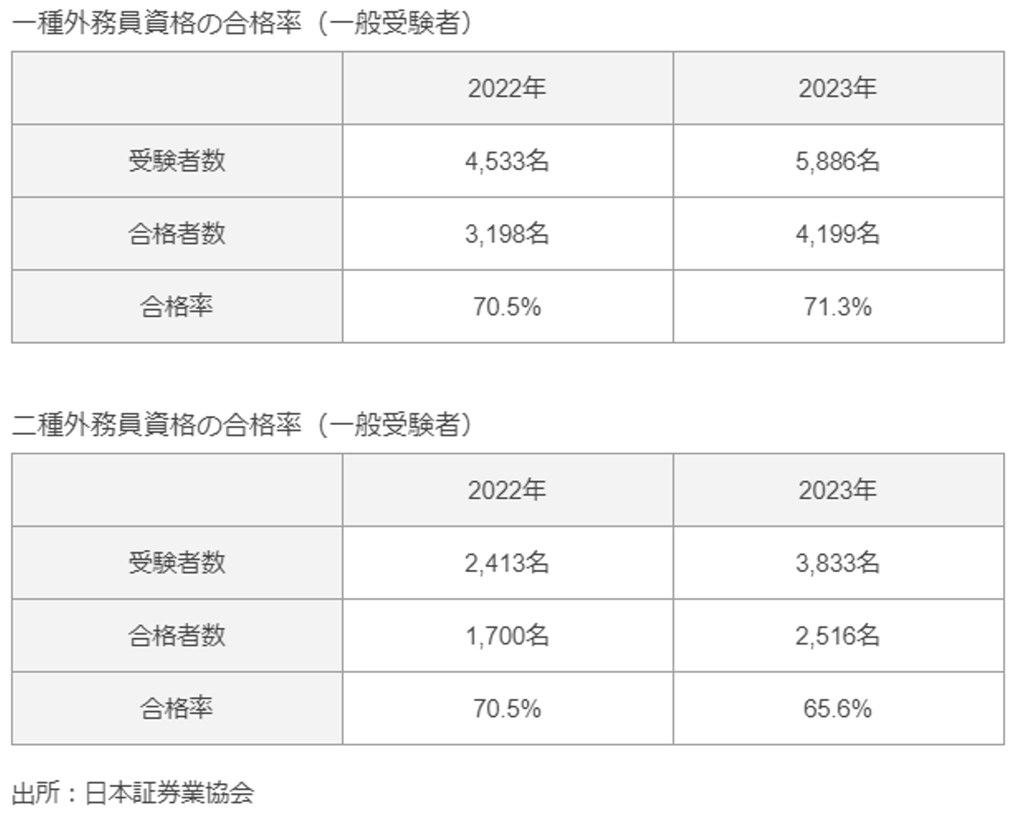 2022年と2023年の受験者数と合格率についてみてみると、受験者数は年々増加しており、合格率は70%前後となっています。(出所:日本証券業協会の公式サイト)