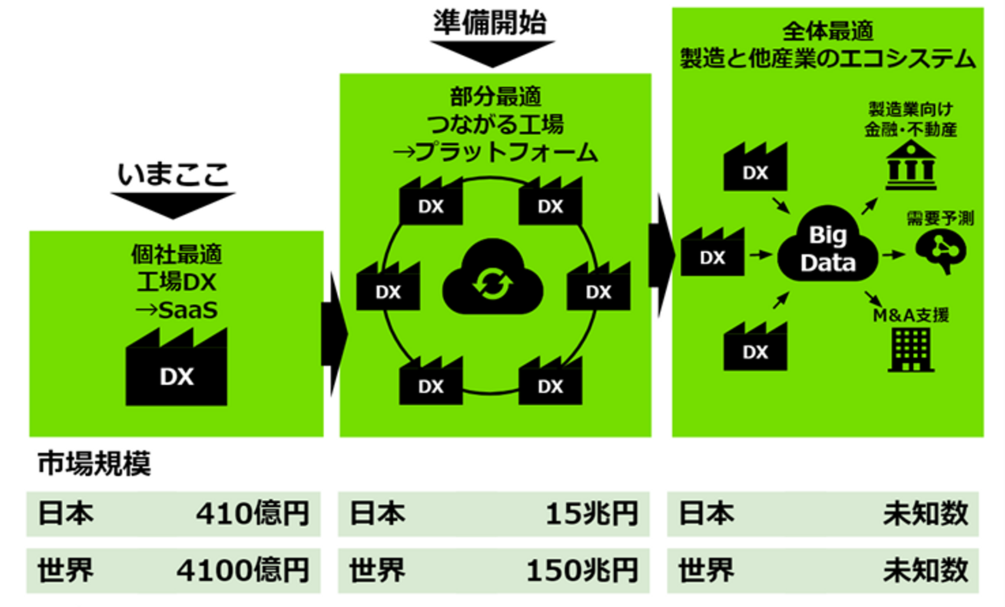 そこで、まずは中小製造業の基盤と体力づくり=デジタル化で個社最適をし、デジタル上で「つながる工場」をプラットフォーム化しようとしていることが現在の我々の取り組みです。そしてそれを製造業以外も巻き込んだ新しいエコシステムへと進化させていこうとしています。