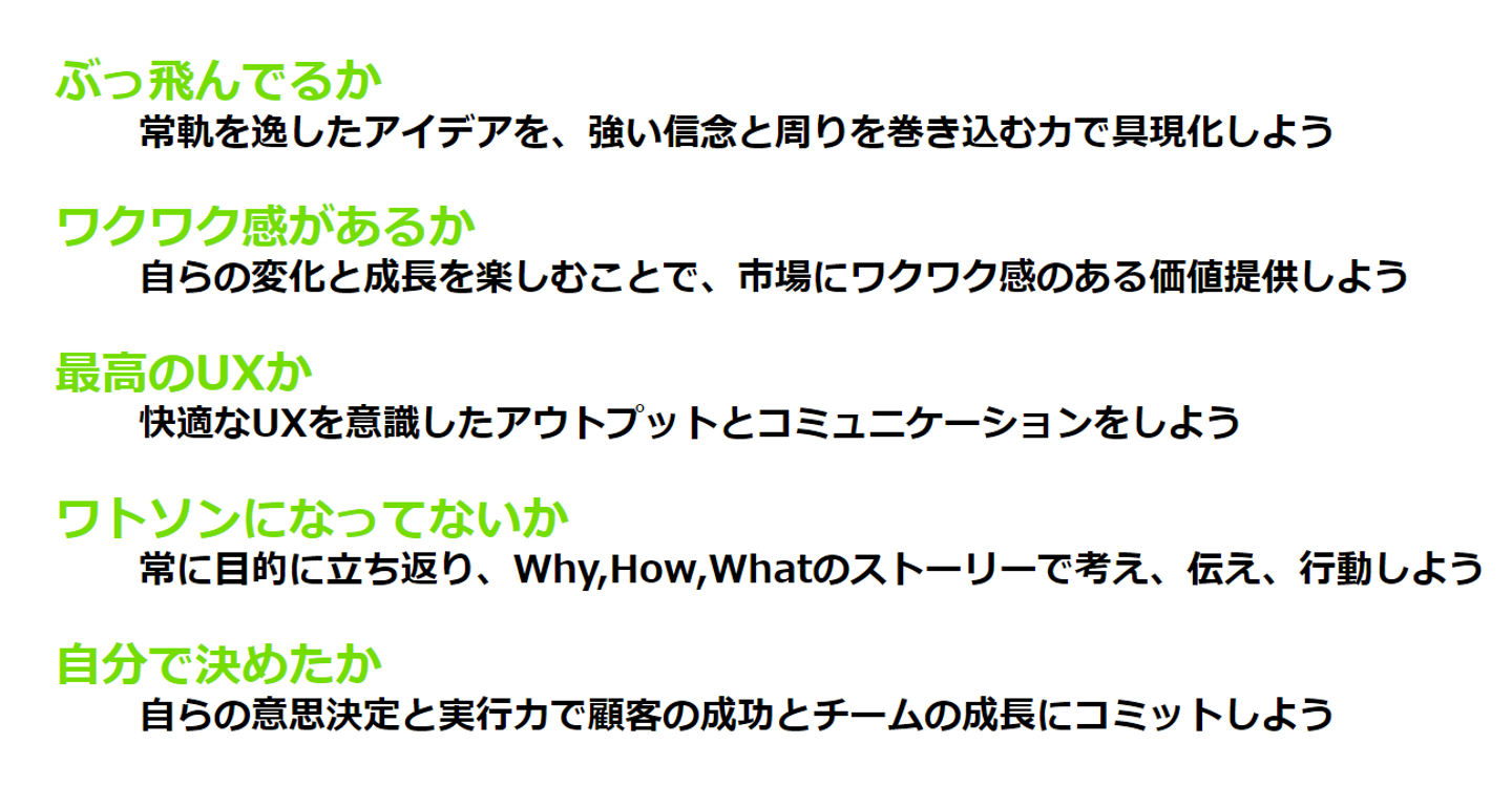 また、働く上で、5つの価値観を大事にしており、社風に通ずる部分でもあります。