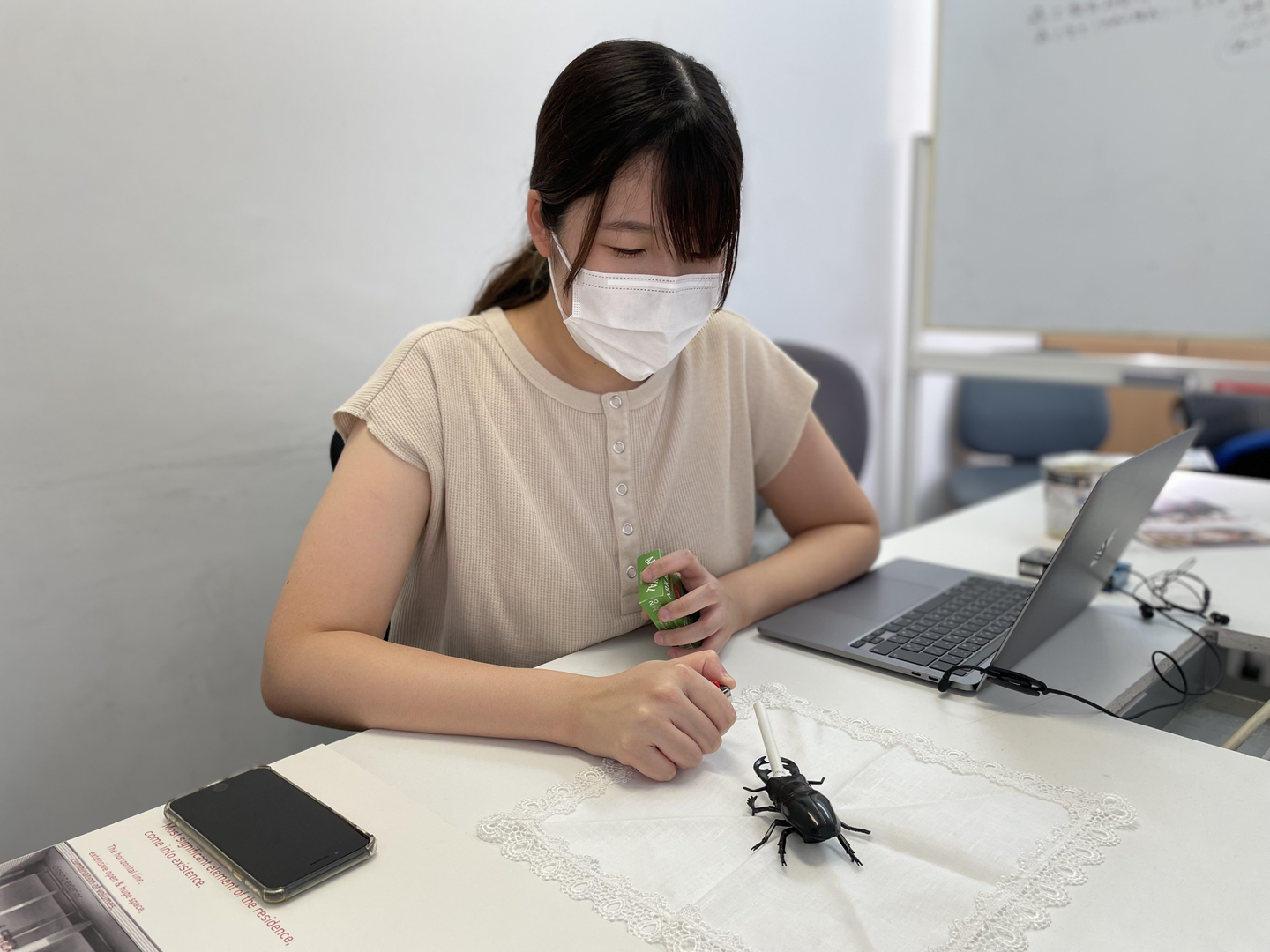 【撮影協力してくれたヤニクレスオオクワガタ(100円のおもちゃ)を労わるソヤさん】※写真はフィクションです。