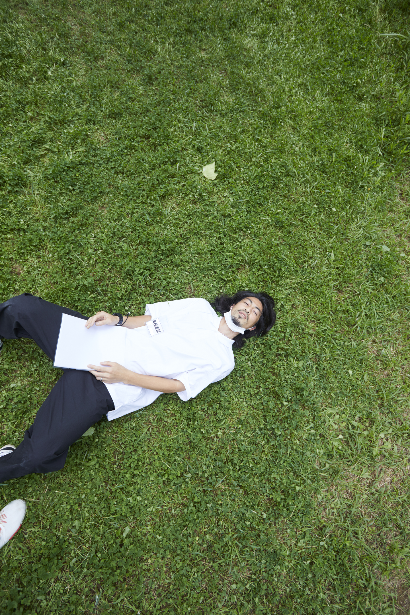【トップ画像の別アングル】ロケハンで気持ちよくなっちゃって芝生に寝転がっちゃうツブさん。
