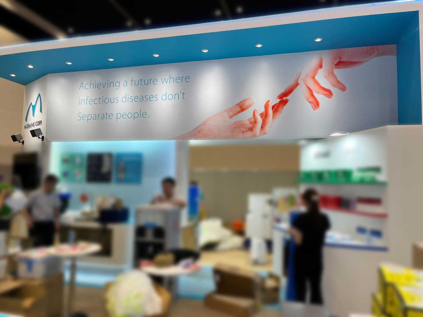 白とモレーンブルーが基調のブースに、温もりやつながりが一目でわかる『手』のモチーフを配置し、Visionである「感染症が人と人を遠ざけることのない未来を実現する」の英訳文を配置したデザインを提案しました。