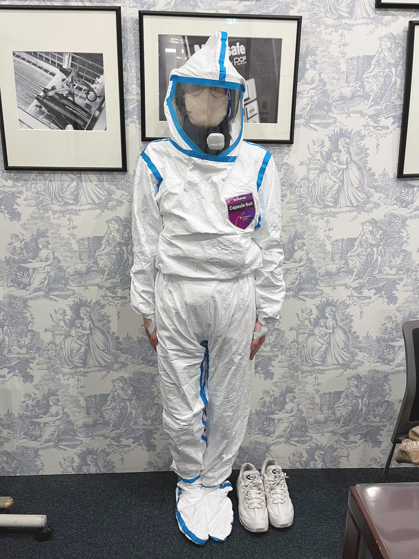 (研修時に自社製品のカプセルスーツを体験しました。)