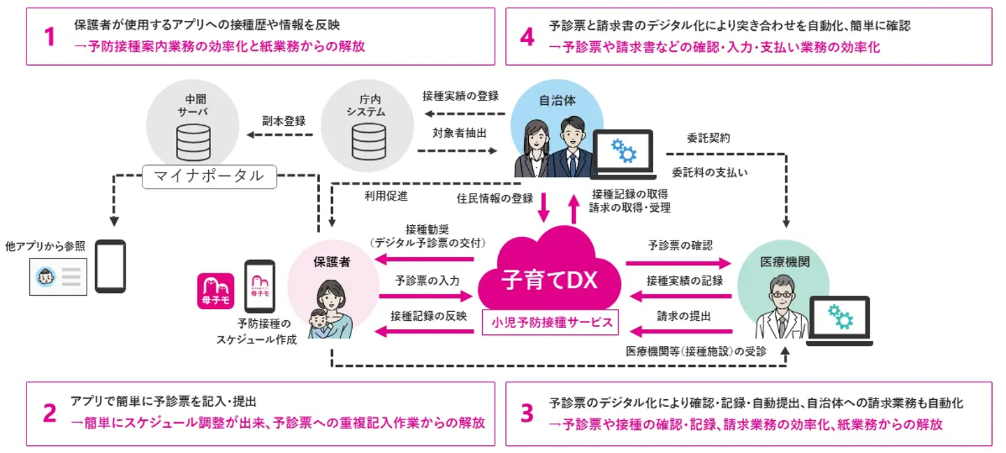 『母子モ 子育てDX』の「小児予防接種サービス」は、子育て世帯、自治体、医療機関を対象にした乳幼児期の予防接種に係る手続きのオンライン化を支援するサービスです。