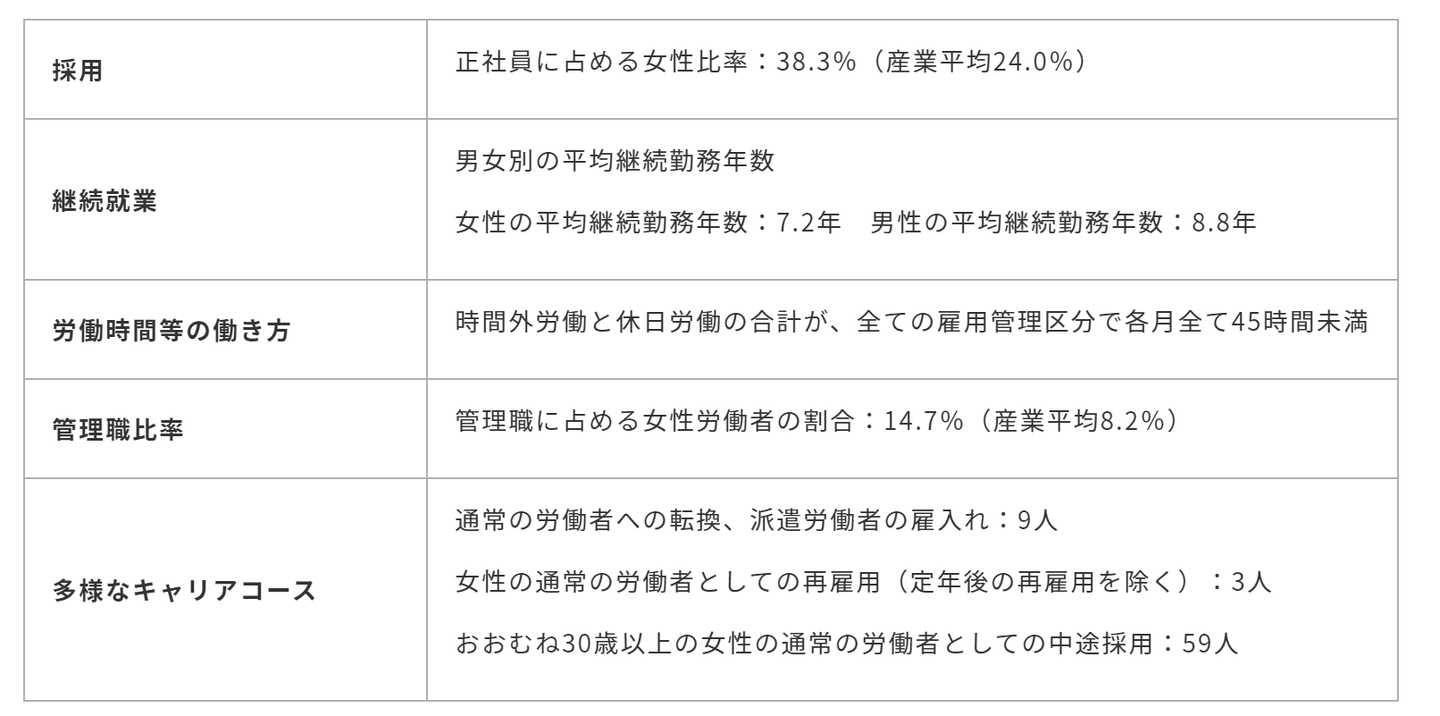 ※採用・継続就業・労働時間等の働き方・管理職比率は直近の事業年度の実績から、多様なキャリアコースは直近3事業年度の実績から算出