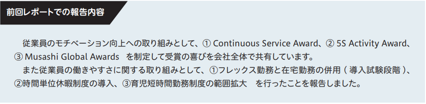 昨年、フレックス勤務と在宅勤務の併用について池袋本社勤務のホールディングス従業員を対象に導入試験段階であることを報告しました。この段階でこれら制度が利用できる職場と利用できない職場間での不公平感、職場ごとのあいまいな解釈による運用面での問題が発生しました。原因の一つである制度化した文面(規定)がないことや適用範囲を日本拠点の全従業員に展開するために、全部門長と議論を重ね制度設計を行いました。また、両制度の利用が難しい職場には新たに時差 勤務制度を設定して、より多くの従業員が利用できる選択肢を増やしました。今後は運用を通じ、抽出した問題の解決を図りながら、従業員の働きやすさの向上に取り組んでいきます。