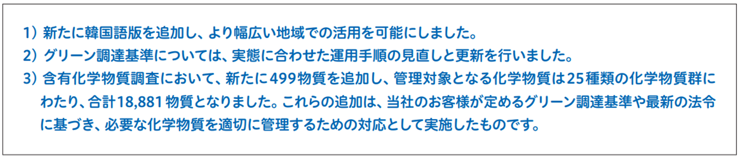 2024年9月に、当社グループグリーン調達基準の第10 版を発行しました。 本改訂では、以下の点を更新しました。