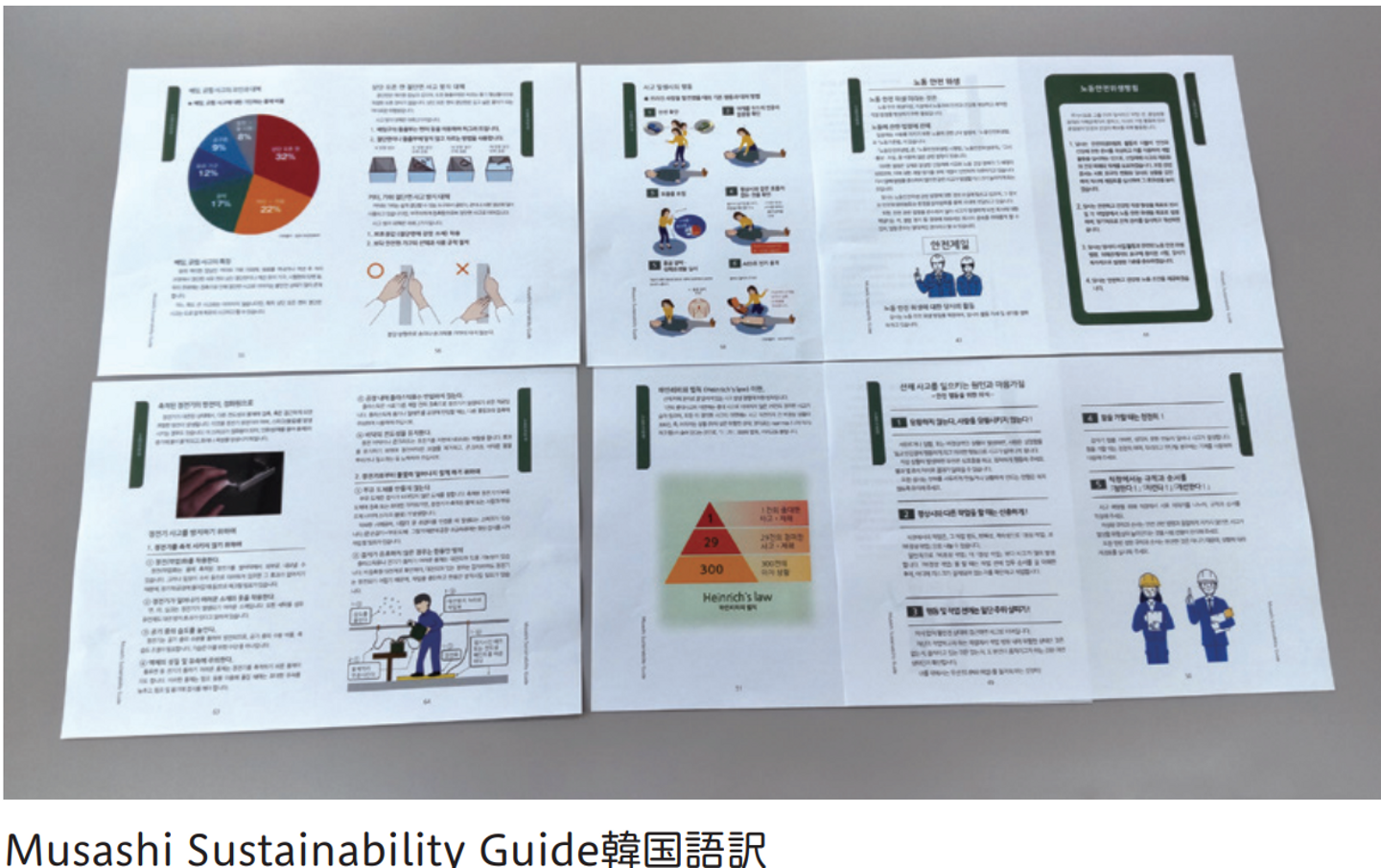 昨年発行しました「Musashi Paint Report 2024」のP.16(CSR啓発教育)に記載のMusashi Sustainability Guideは当初日本語のみの発行でしたが、現在は各拠点で現地語に翻訳が行われています。韓国拠点では日本語を理解できる従業員が一つ一つの項目を丁寧に翻訳することで同時に記事内容の理解につなげ ています。特に労働安全衛生に関するページは朝礼などで復唱して有効に利用されています。