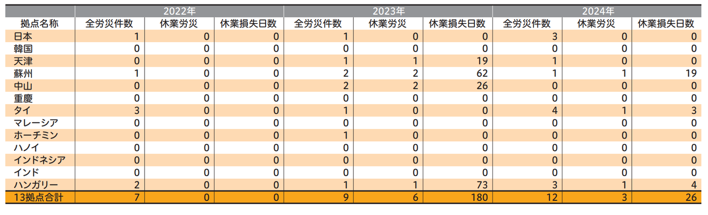 海外拠点と月に1回「HD 生産定期会議」を開催し、発生した災害の概要・原因・対策を共有することでグループ全体の安全意識向上に取り組みました。また、これらの内容は毎月開催される「安全衛生委員会」で報告し、各部門にも展開することで社内全体の安全意識を高めています。このように海外拠点と日本拠点の両方で情報を共有しリスクの低減と事故の未然防止に努めています。
