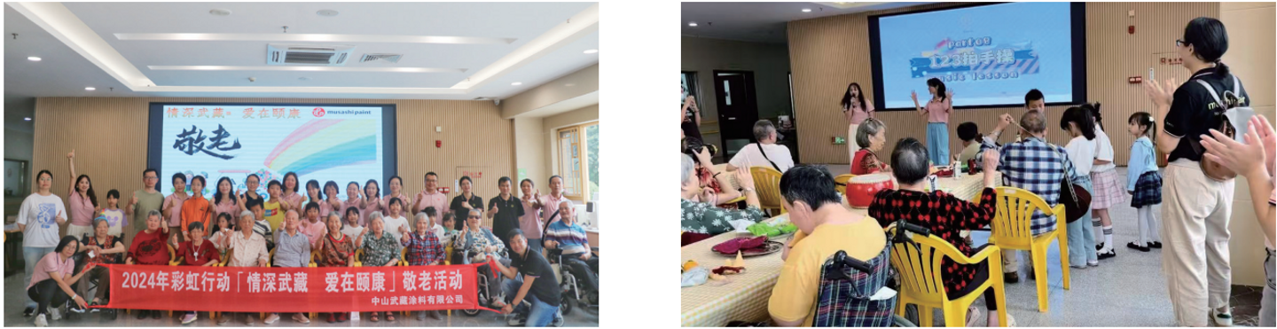中山拠点では、「情深武藏・愛在颐康(愛に満ちた武蔵は、その深い愛を颐康*に)」をテーマに敬老活動を実施しました。中国では旧暦の9月9日が「老人の日」で、お年寄りを大切にする習慣が古くからあります。中山拠点では、毎年9月に老人ホームでの訪問活動を行っており、同老人ホームには今回で、3回目の訪問となります。今回は、60名の方と当社従業員30名が交流し、体力強化と健康促進を目的とした軽度な運動を行ったり、一緒に伝統的な健康グッズを制作したりして、楽しみました。参加者は手作りの達成感を感じるとともに、実用的な健康知識を学ぶことができました。