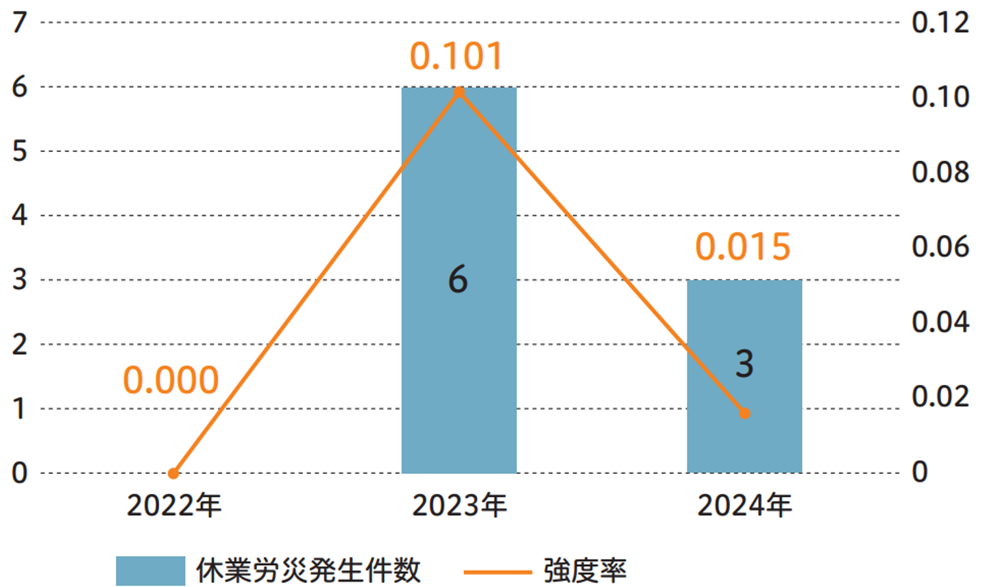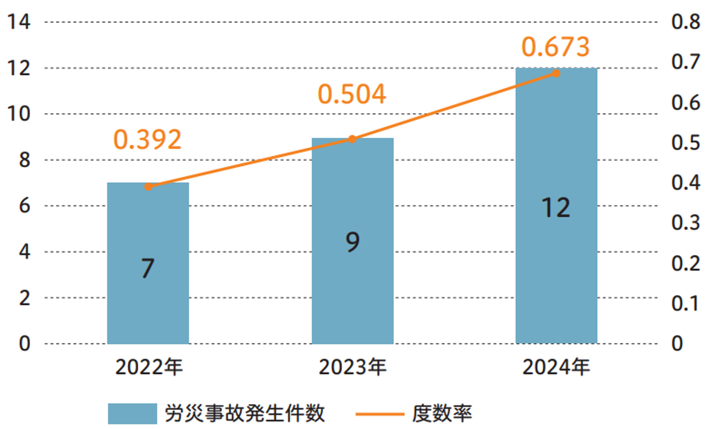 当社グループの度数率や強度率は、2023年の強度率*を除き、日本の製造業平均(令和5年度:度数率1.29、強度率 0.08)を下回っているものの、度数率がこの3年で増加傾向となっていることが判明しました。以前から各拠点で労働安全衛生に取り組んでいましたが、今後は情報を共有して労災事故の撲滅をめざしていきます。