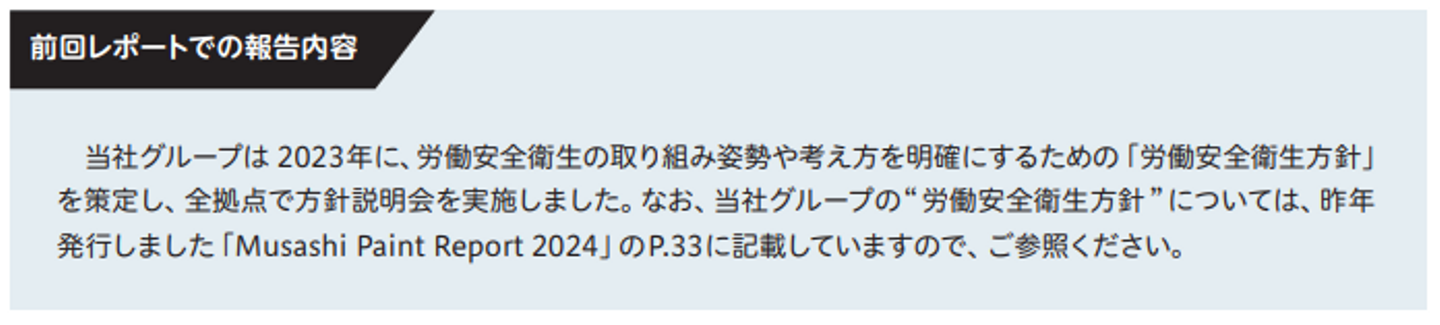 当社グループは 2023年に、労働安全衛生の取り組み姿勢や考え方を明確にするための「労働安全衛生方針」 を策定し、全拠点で方針説明会を実施しました。なお、当社グループの“ 労働安全衛生方針 ” については、昨年発行しました「Musashi Paint Report 2024」のP.33(労働安全衛生への取り組み)に記載していますので、ご参照ください。