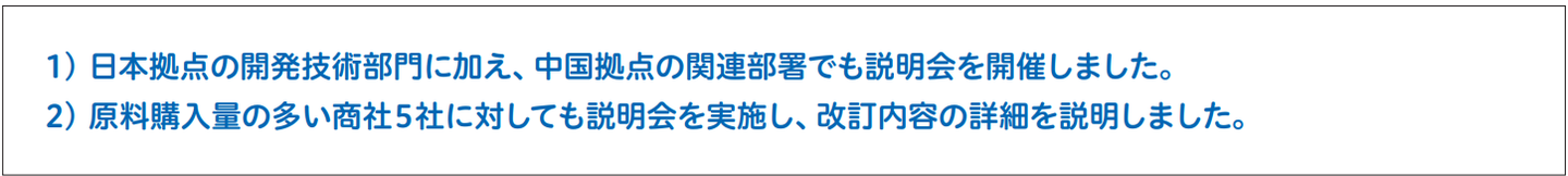 特に、お客様によっては法令よりも厳しい要求事項や 規制を定めている場合があるため、追加で化学物質の含有調査をお願いするケースがあることについても説明を行いました。