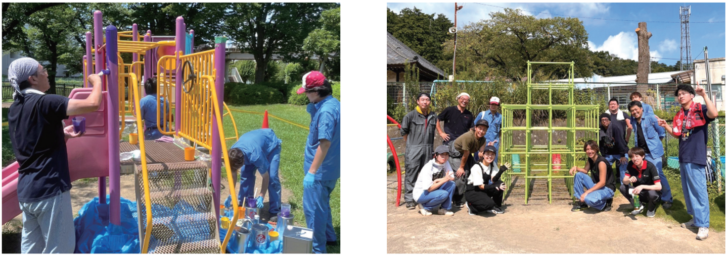 P.28(廃棄物排出量の削減に向けて)でもご報告しましたが、日本拠点では工場が所在する入間市と協議のうえ、公園や保育園の遊具の再塗装を実施しました。活動のきっかけになったのは、ある従業員の家族が利用する公園の遊具の塗装が剝がれており、それを見た子どもがとても悲しそうにしていたことでした。「この悲しそうな顔を笑顔にしたい」との思いから、入間市役所にご相談させていただき、担当課の皆様との度重なる打ち合わせを経て、2024年中に公園2か所、保育園1か所の遊具再塗装が実現しました。