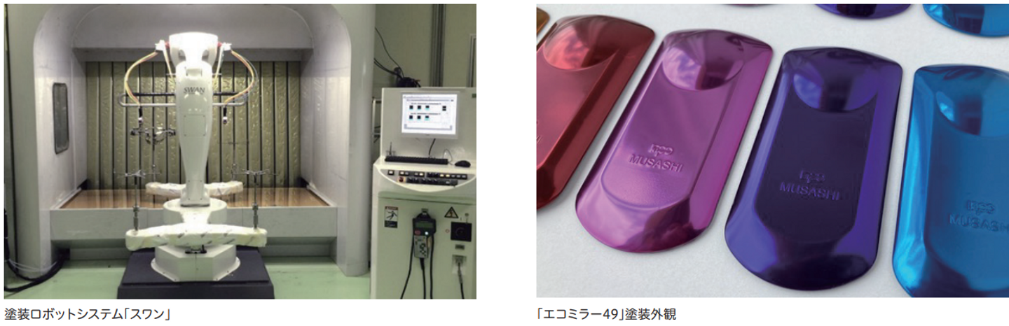 タクボエンジニアリング株式会社様との共創により、塗装ロボットシステム 「スワン」と当社のインジウムコーティングシステム「エコミラー49」でミラーコーティングを実現しました。塗装の均一性、密着性に優れ、従来のめっき工程に比べ環境負荷を大幅に低減しつつ、優れた耐久性と高い鏡面特性を発揮します。 塗装ロボットシステム「スワン」は精密な塗装が可能で、複雑形状の部品にも均一なコーティングを施せるため、光学部 品、電子機器、装飾品など多様な分野で活用可能です。