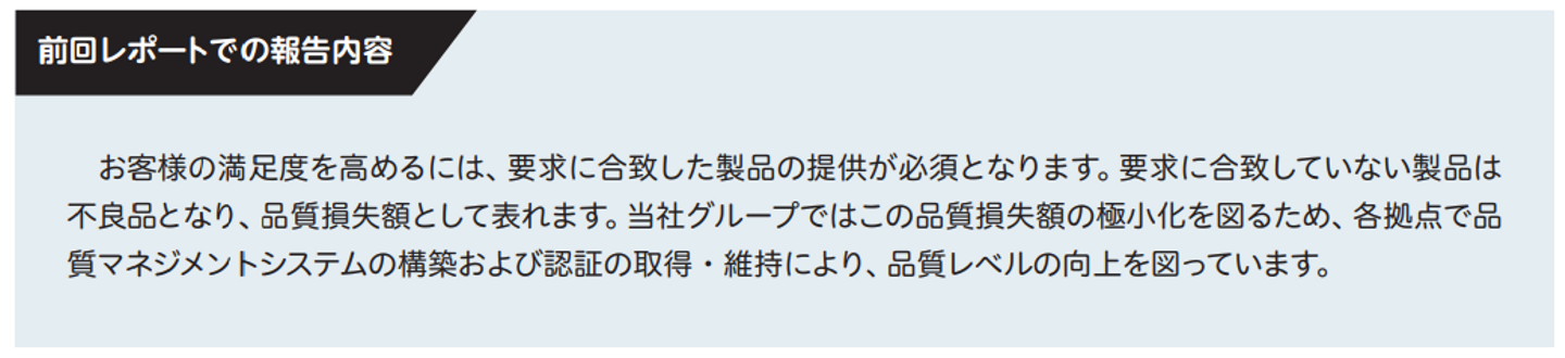不具合の発生を未然に防ぐため、グローバルで不具合の予防処置活動を行いました。当社グループの12の工場で 150 件を超える提案があり、最も多い工場では29件の提案がありました。また、過去のクレーム事例のうち代表的なものを50点ほどピックアップし、クレームで得た教訓を拠点同士でわかるようにしました。教育の面においては、コード体系のような社内のルール、原料や塗料の知識、検査の知識、設備の知 識などに関する資料を作成し、現地での教育の進捗管理を行いました。この教育は今後も引き続き継続する予定です。