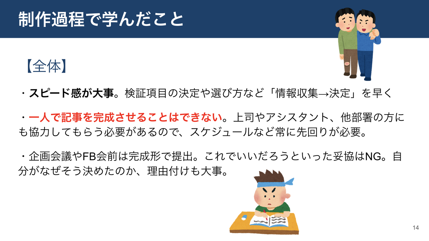 先輩社員の方々からは多くのアドバイスやフィードバックをいただきました。個人的に1番印象に残っているのは「わざわざマイベストのコンテンツを見てくれている人に向けて書くことを意識する」というお話です。