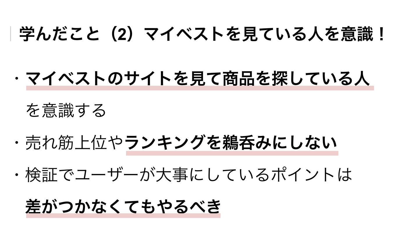 商品の選び方に関して、「新しい基準を自分たちで確立することが大事」とフィードバックをいただきました。「自信を持って挙げた選び方のポイントで検証することで、ユーザーに寄り添った良いコンテンツが作れる」というアドバイスもいただいたので、意識して取り組みました。