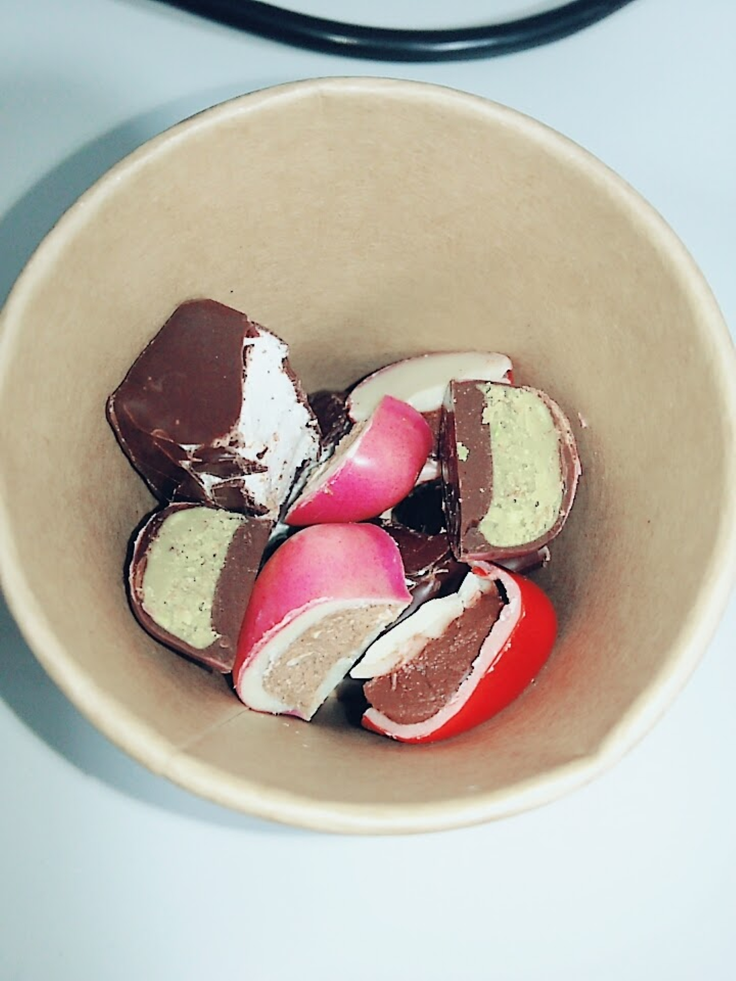 公平性を保つために、綺麗な形の高級チョコも包丁でカットして紙コップに入れて審査開始です!