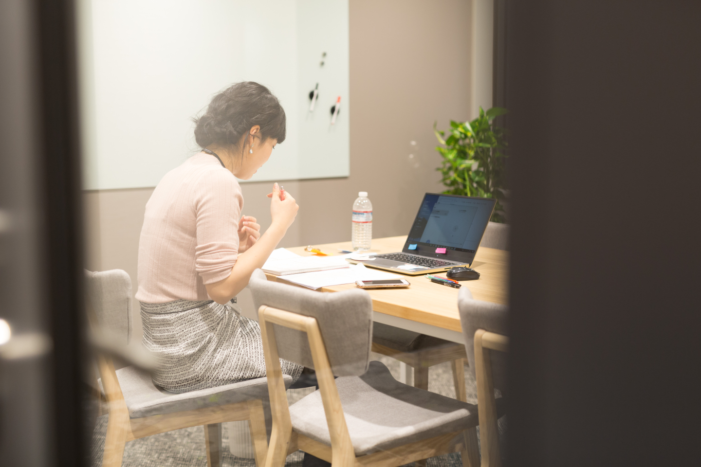 会議室で仕事をされている社員さんを発見。メインのワーキングスペースや会議室から離れているので、かなり集中して仕事ができます!