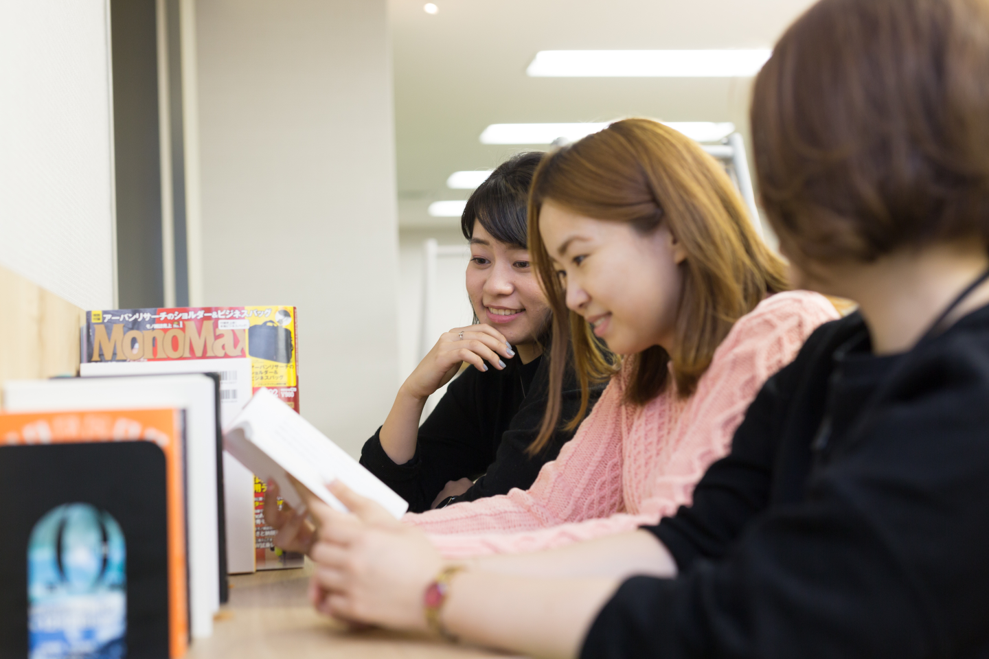 気分転換に本棚を物色している女子社員たち。何の本を読んでいるのでしょうか?